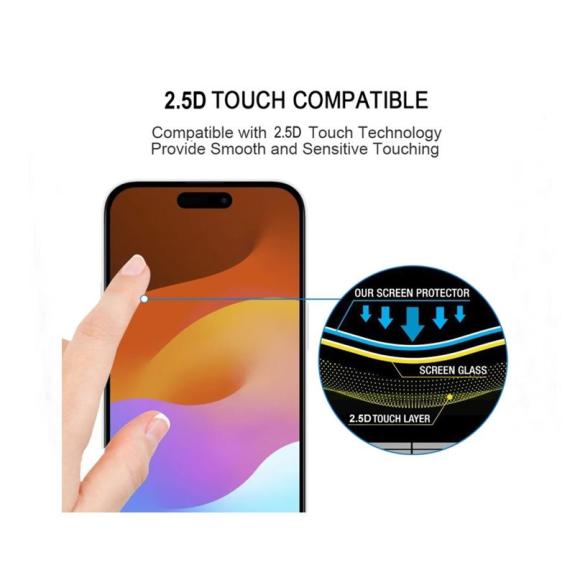 Cristal templado protector de pantalla para iPhone 15 Plus en color negro.